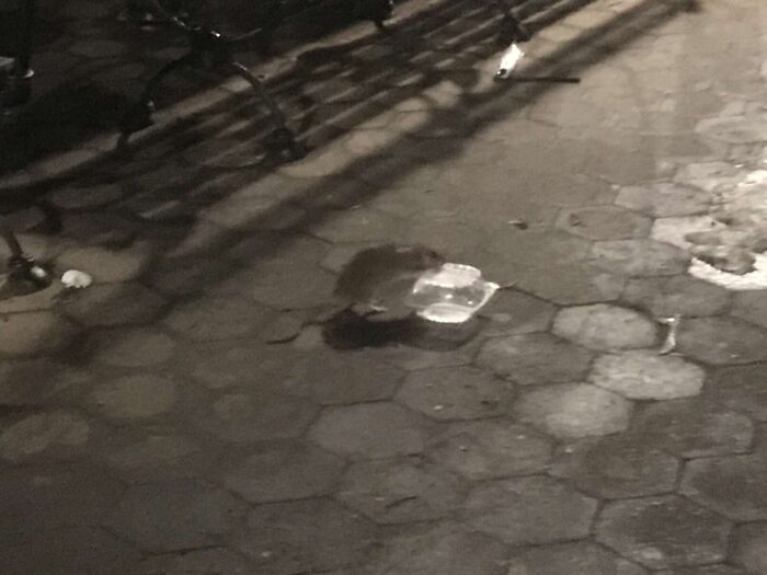 A rat and plastic in Washington Square Park, of the many due to garbage and litter