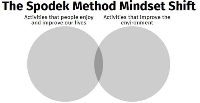 One aspect of the Spodek Method is that it leads people to find an activity that both brings intrinsic reward and improves the environment. Many people struggle to find something in the overlap, I believe because they have been told so much and so exclusively that sustainability means deprivation and sacrifice.