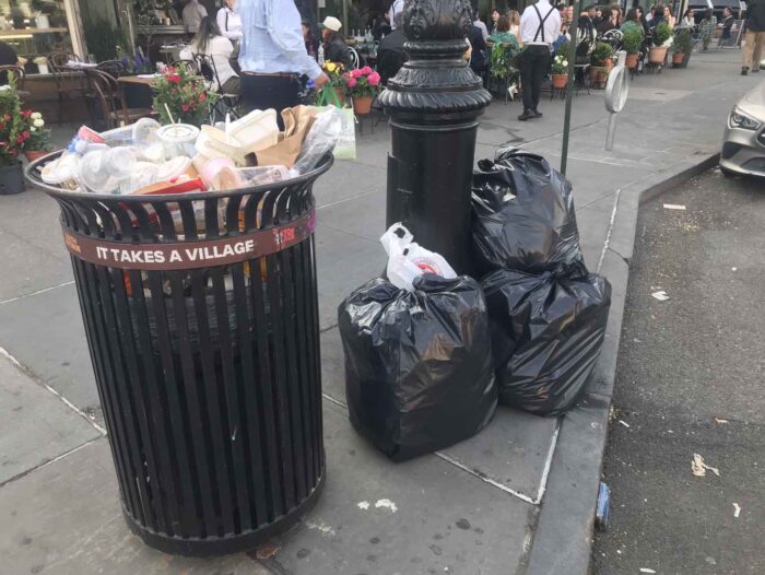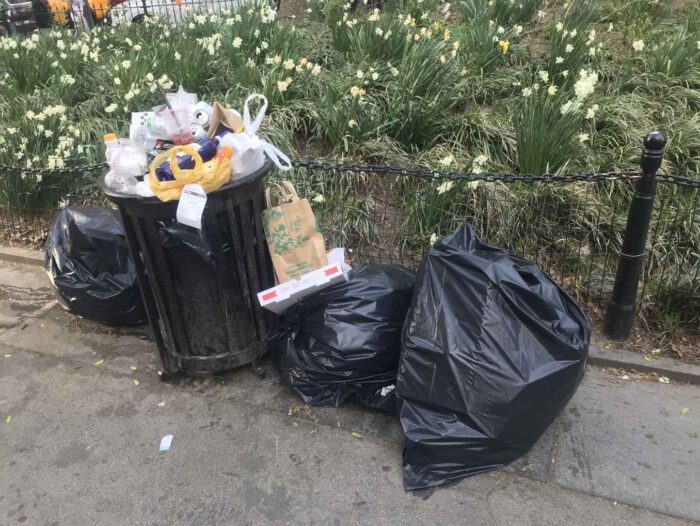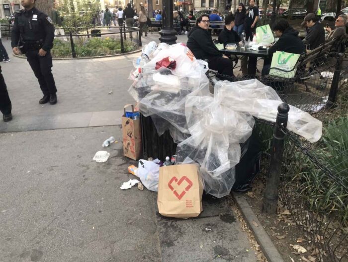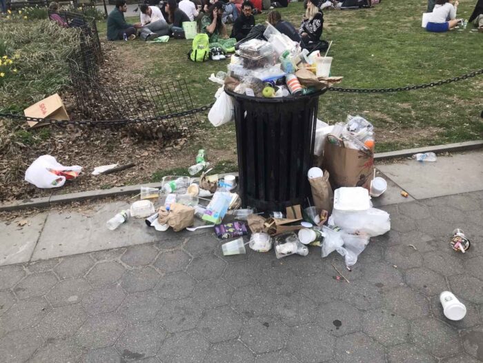 Yesterday, April 20th, is a big holiday for people who love cannabis and many cannabis lovers love Washington Square Park so it was more crowded than usual, but it’s not a national holiday or that big. Yet look at the garbage on a mostly regular day. I just took a few pictures, but every can was beyond full to overflowing. Each became the center of an ever-growing pile of garbage.