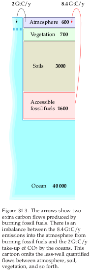 The text of the book I talked about yesterday and the day before, Sustainable Energy — Without the Hot Air, explains the time scales on which carbon can flow into and out of different places. For example, carbon can’t reach the huge sink of the deep ocean except through the surface waters, which circulate into deep waters over thousand-year time scales, meaning we don’t know how to access most of the planet’s carbon and potential carbon sinks on time scales relevant to us.