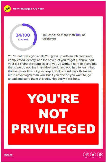 I suspect Buzzfeed and most people would expect a straight white American man to rate near the maximum, but they wrote the questions. Wikipedia says the site’s audience is described as left-leaning so I doubt they felt motivated to write questions to make my privilege seem less.