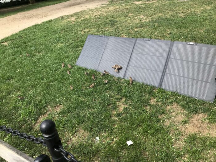 One day charging with solar in Washington Square Park, I saw a bunch of birds flapping around on the panels. I’m not sure if you can see them playing around in this picture. The video below partly captures their playfulness, but not as much as seeing them. They’d flap up onto the panel, then flap around up and down, solo, in pairs, and in groups. It was a warm day,[…] Keep reading →