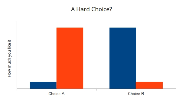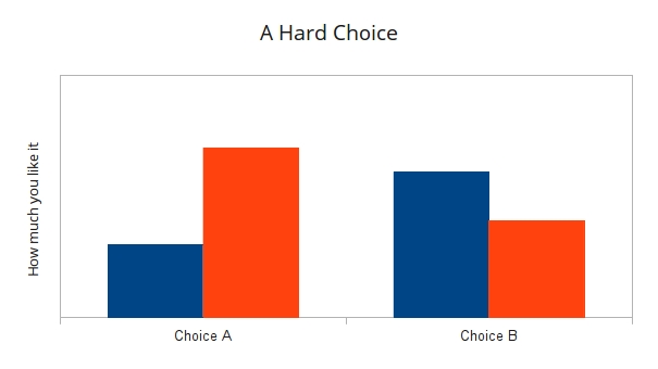 Once you have multiple options, the choices can become much harder than two-option choices. You might strongly prefer one part of one option and slightly prefer the other so that the total values of each option are nearly equal. Such choices can be hard. Consider, for example, choosing between