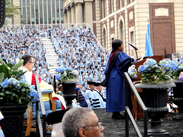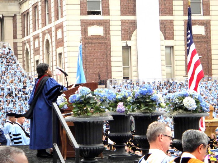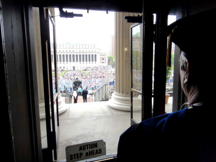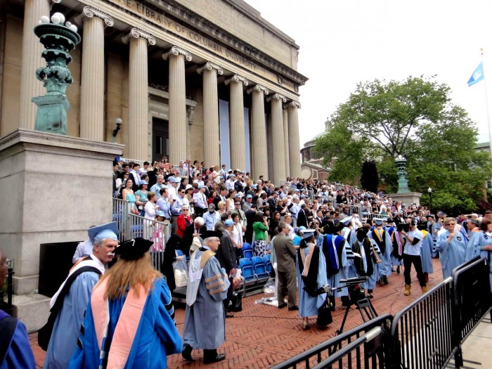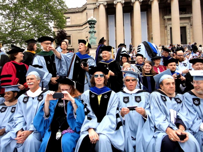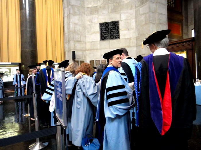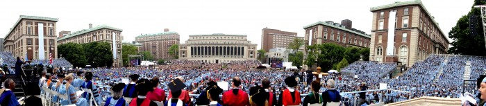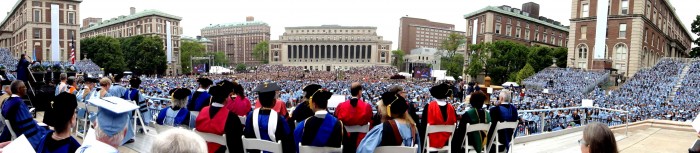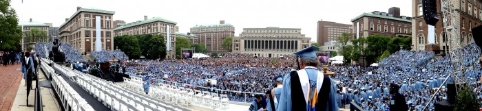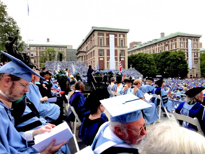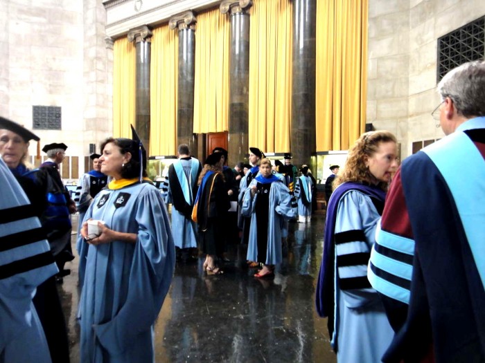 This slide show starts with the faculty in our pope-like robes in a pre-commencement reception among the grand columns of Columbia’s Low Library, followed by us walking out onto the stage, a few pictures of us and the commencement speakers, followed by us exiting.