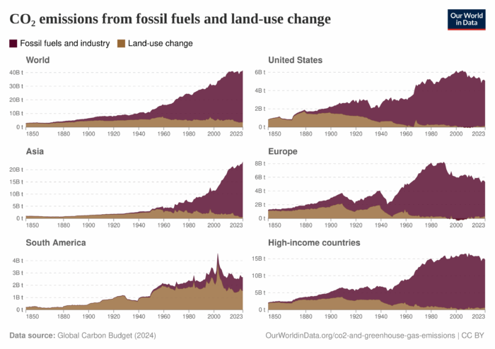 Breaking the data down by region back to 1850, CO₂ emissions from fossil fuels and land-use change. Fossil fuel pollution has dominated nearly everywhere except South America. I guess clearing the world’s largest rain forest adds up. Still, CO2 is catching up there.