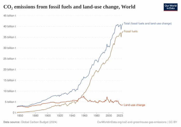 Here were the relative contributions from a couple years ago, in CO₂ emissions from fossil fuels and land-use change, World, 2023. Fossil fuels contributed over 10 times more.