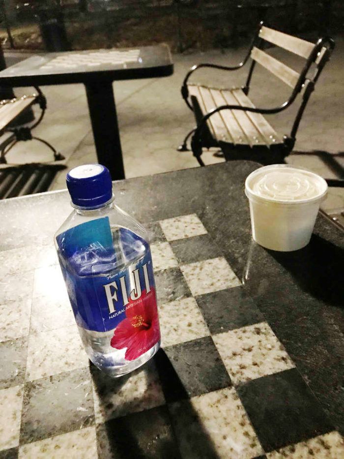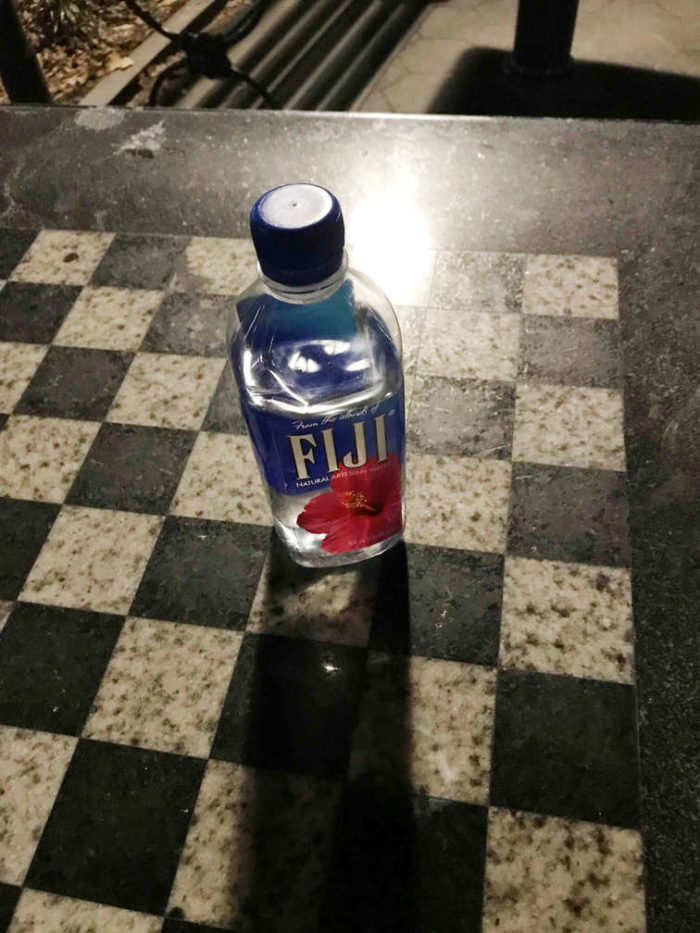 Picking up litter in Washington Square Park I found yet another discarded mostly full plastic bottle of Fiji brand water.