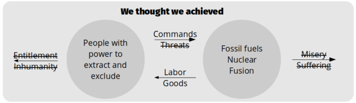 In this system, the biggest change is in the circle on the right. Replacing people with fuels, they thought they wouldn’t need the threats, wouldn’t cause misery and suffering, wouldn’t feel so entitled, and wouldn’t lose their humanity. Instead of their relevant power being to deprive people of rights and liberties, they’d work with fossil fuels.
