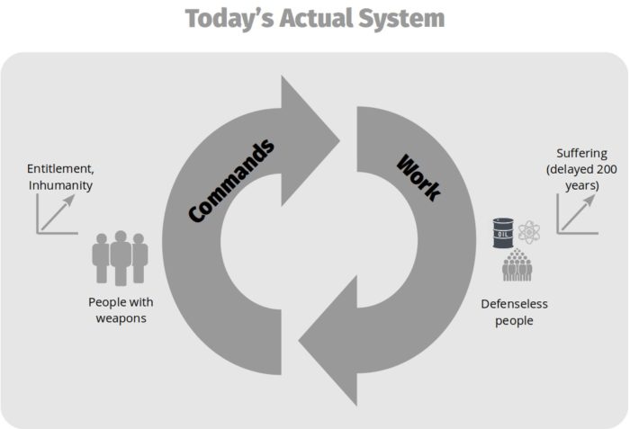 This diagram shows one group as people with the power to confine others and cause them suffering. The other group lacks that power. The powerful group uses that power to command and threaten people without that power to get labor and goods from them. That’s the main cycle. It causes people without power misery and suffering. People with power develop entitlement and inhumanity. Nobody wins, not even the powerful, if their consciences matter.