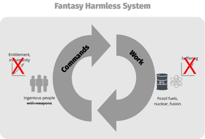 In this system, the biggest change is in the circle on the right. Replacing people with fuels, they thought they wouldn’t need the threats, wouldn’t cause misery and suffering, wouldn’t feel so entitled, and wouldn’t lose their humanity. Instead of their relevant power being to deprive people of rights and liberties, they’d work with fossil fuels.
