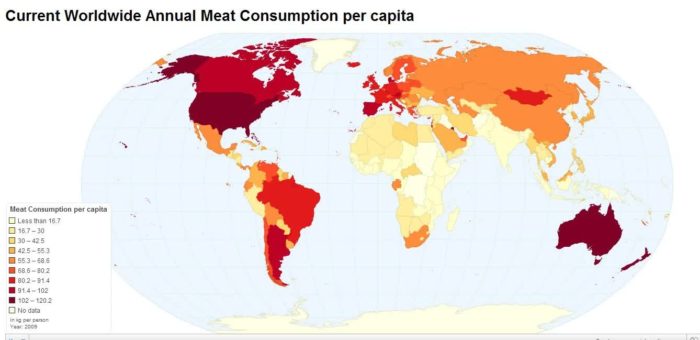 And here are Current Worldwide Annual Meat Consumption per capita. I didn’t realize the U.S. would stand out so much. I thought Brazil and Argentina ranked higher.