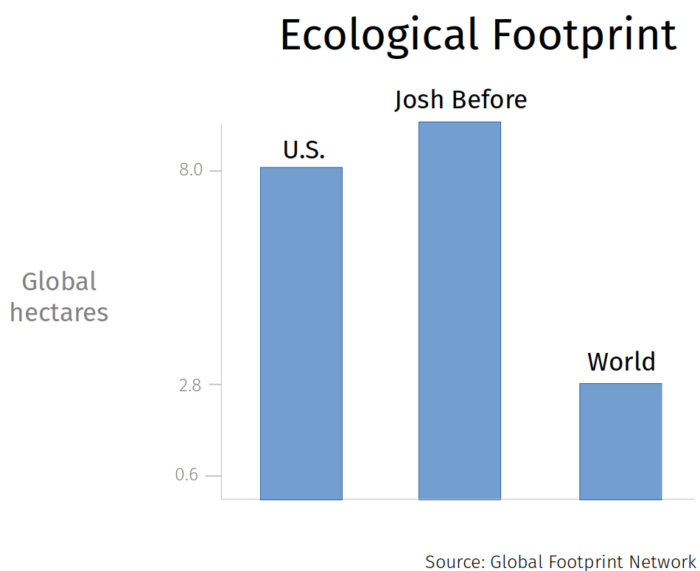 Imagine the people in the rest of the world hearing an average American suggesting how to lower their footprint. They must see the average American giving advice like a heroin addict advising how to stop taking heroin. Can anything more clearly state that American’s first task should be reducing our pollution? I guess I could add that consumption and quality of life don’t correlate for most Americans beyond a minimum, though they don’t cause nearly the pollution as everyone else.