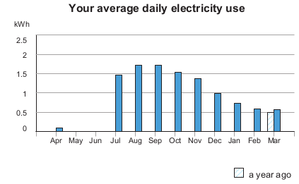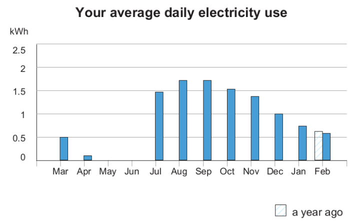 Here’s my power use over the past year. Last winter I unplugged my fridge in late December, so this winter I added an extra month unplugged. You can see my power use lower, to about 0.75 kWh per day.