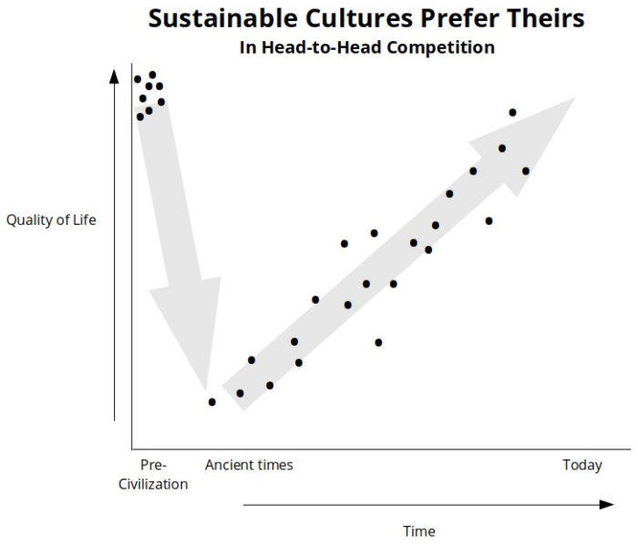 It’s simplified, of course. Cultures in the upper left continue today so points representing them should continue through time across the top. Not all of them have qualities of life higher than us today. My point is to show the falseness of the mainstream myth.