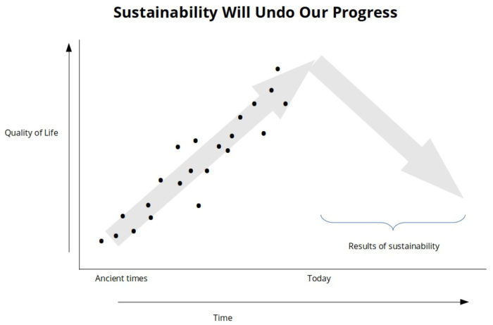 Since we’re progressing as fast as we can, any deviation, including sustainability, means losing that progress. I believe this graph illustrates how people imagine sustainability would affect civilization—that is, it would move us backward: