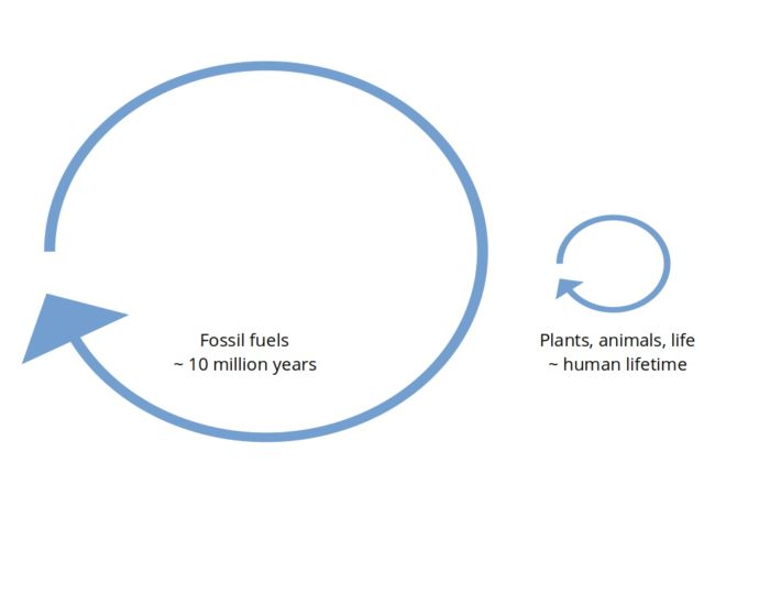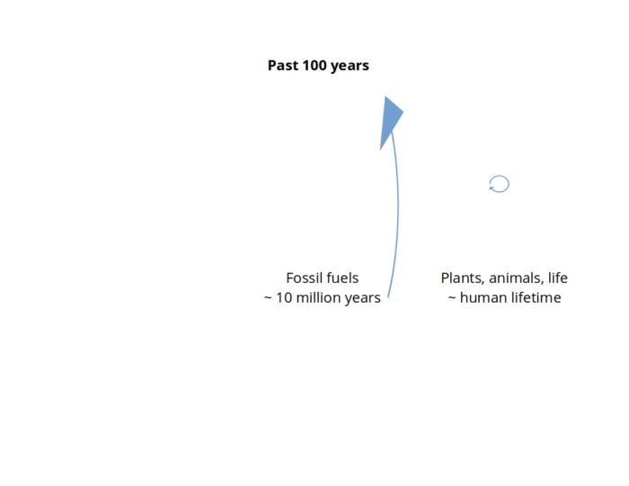 But this diagram misses that the cycles’ time scales are very different. The “regular life” cycle happens on century to shorter time scales. The fossil fuel cycle happens over tens of millions of years. Let me illustrate the different time scales: