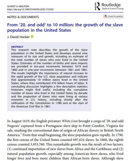 I wrote recently in When changing fast is easier than slow about the growth in number of slaves in the United States based on a peer-reviewed paper From ‘20 and odd’ to 10 million: The growth of the slave population in the United States, by J. David Hacker in the journal Slavery & Abolition.
