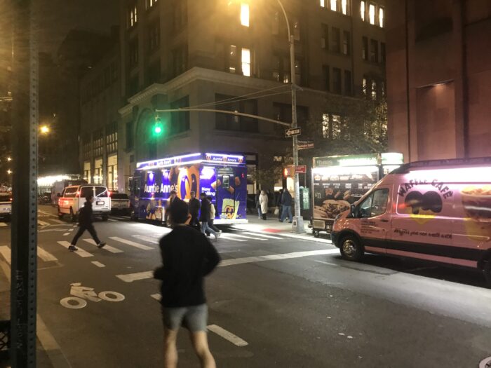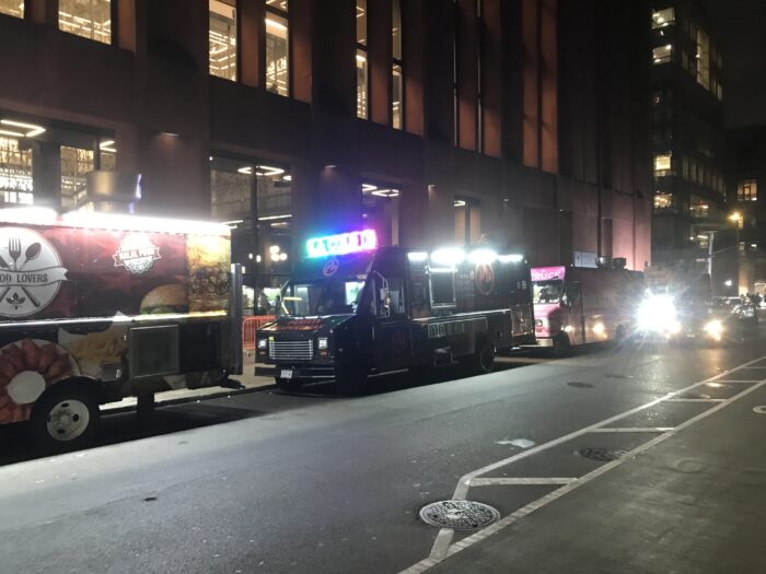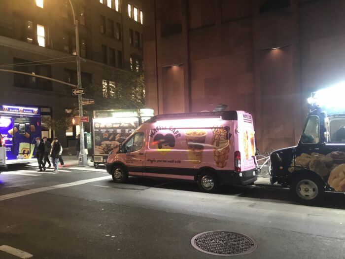 Outside NYU’s main library, spewing gas from their motors and grills, are these trucks, serving doof in disposable containers wrapped in too many bags with too much plasticware. It’s enough to make one want to vomit.
