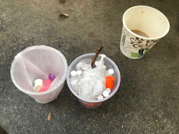 Here are a couple cups of syringes and paraphernalia and a cup of coffee all just sitting under a bench.