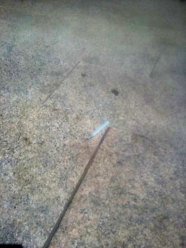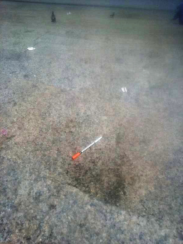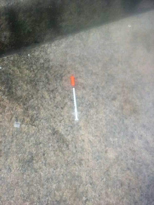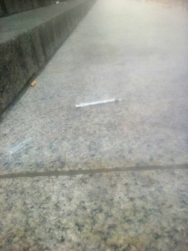 My phone camera’s quality is low and the sun shone too brightly for me to see the screen to crop the images to get more than just the steps, but here are the syringes on the steps of the train station. I didn’t touch them.