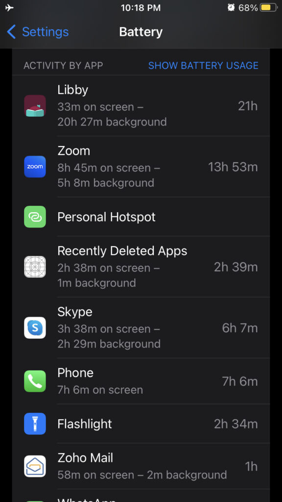 Here’s the the breakdown of battery use by app (taken while in airplane mode, I notice). “Libby” is the library’s app, through which I listen to audio books. Since I turn off screens while eating, listening to books works for me. So does books being free from the library.