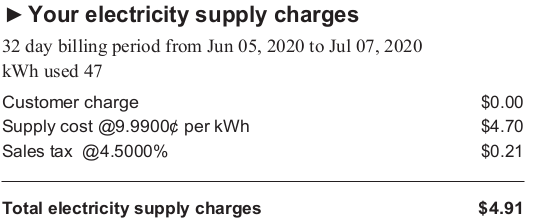 My “delivery charges” were $17.42. I’m paying 58 times more for fixed fees than actual use. You could say I’m subsidizing your grid.