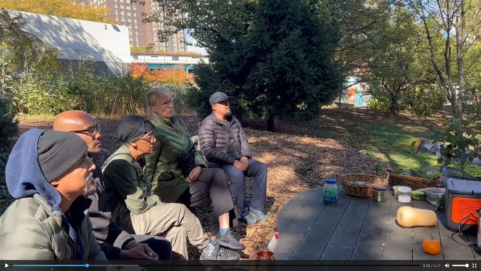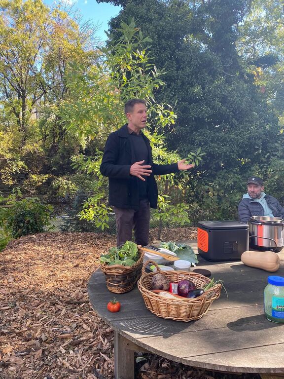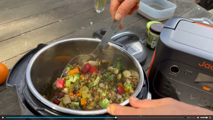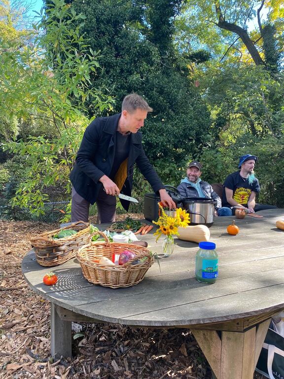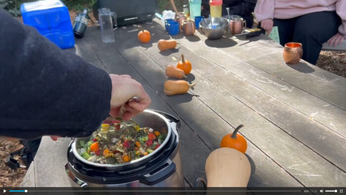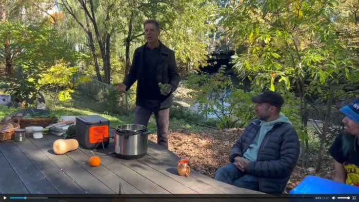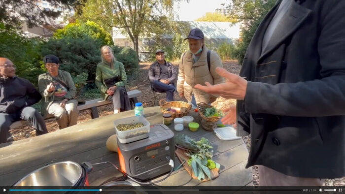 Longtime readers might remember in my first cooking workshop there, before I had disconnected my apartment from the electric grid, we filled the pressure cooker with ingredients, then took it across the street to power it in a deli, come back to the garden for about thirty minutes, go back to the deli, and bring back the cooked stew. This time they had the battery charged.