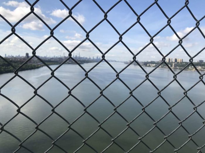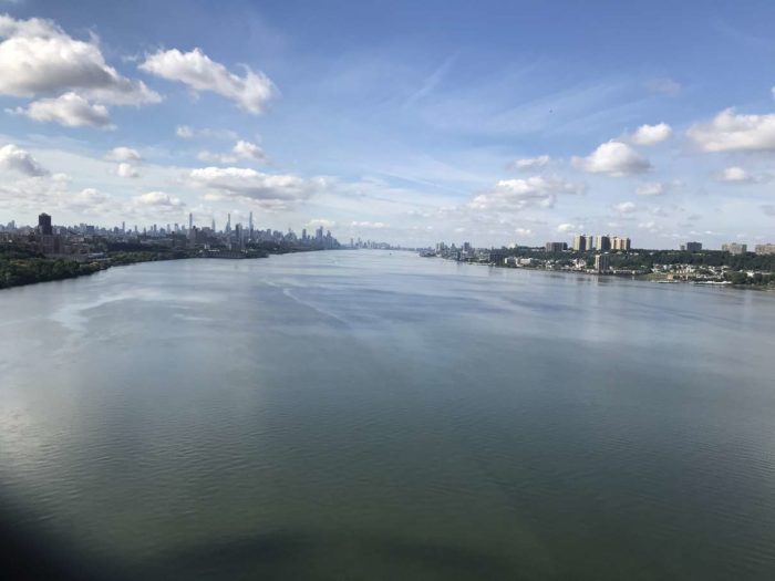 Crossing the George Washington Bridge, under ten miles since starting yesterday morning, Manhattan on the left, New Jersey on the right, the places I swam across down the middle.