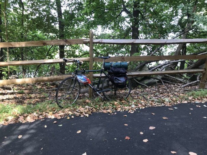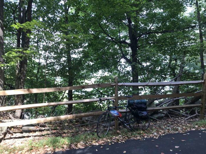 The map says Stoneledge Farm is 130 miles. It’s a holiday weekend so I had time, a tent I hadn’t used yet, and plenty of desire. Working in my favor: perfect riding weather. Not in my favor: a lot more hills than the rides to Philadelphia; the weight of the tent, sleeping bag, and a day of food; and a flat tire at the end of yesterday. I spent many hills in the bike’s lowest gear, especially today, when the path left the Hudson shores.