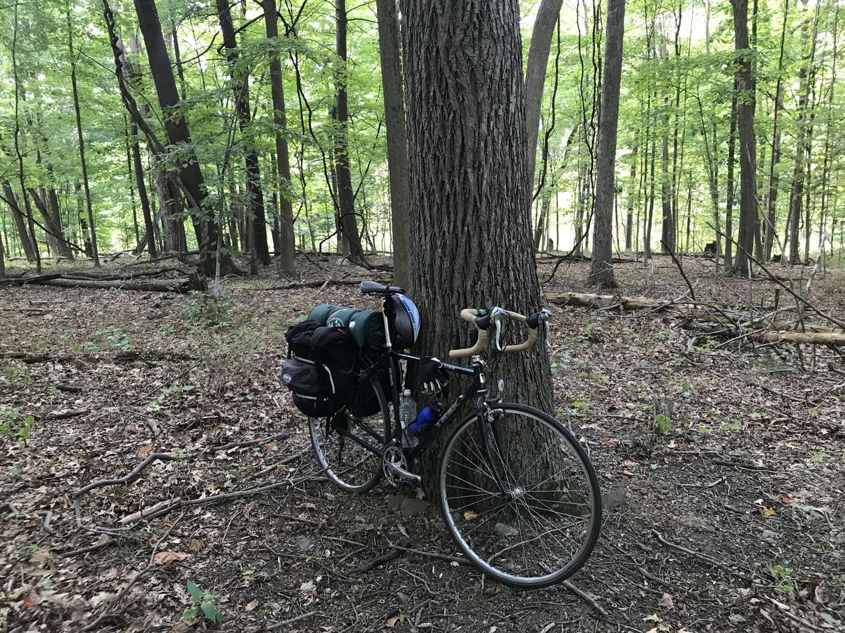 I didn’t look for a campground or hotel. I knew I would find a spot far enough from the road for seclusion, but close enough for convenience. The flat tire decided the spot for me. Here’s the bike just before unpacking and pitching the tent. The road is in the distance behind it.