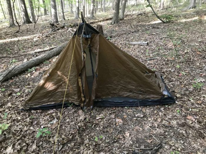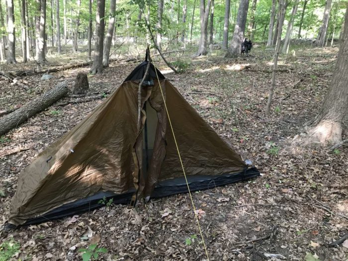 My first time pitching a tent since the 1980s. I was missing the pole and still had to eat dinner and fix the flat before dark so went for quick and dirty over doing it properly. It did the job of keeping me safe and mosquito-free: