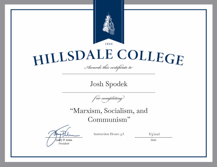 EDIT, August 3, 2025, My third Hillsdale course certificate, for Marxism, Socialism, and Communism: