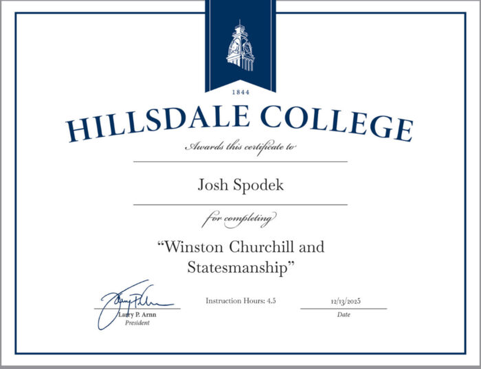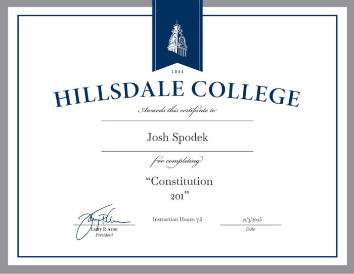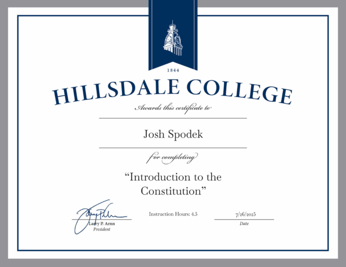 EDIT, July 26, 2025: My second Hillsdale course certificate, for Introduction to the Constitution: