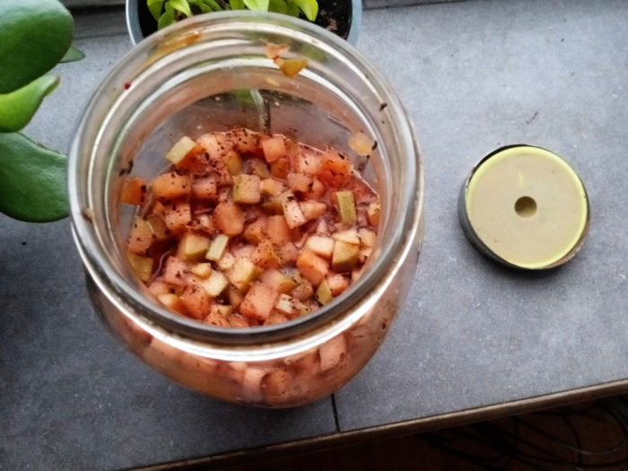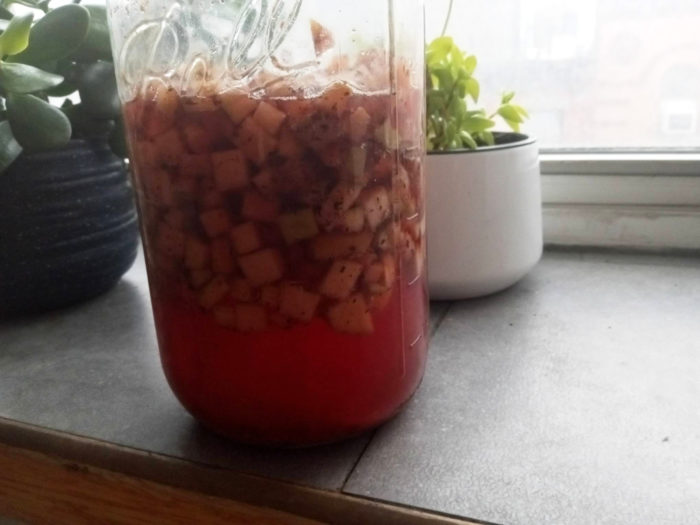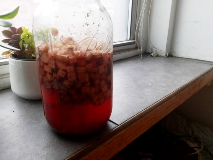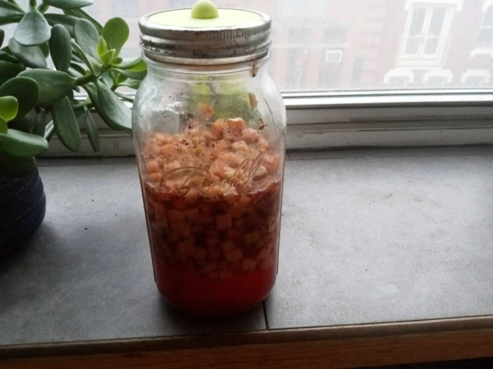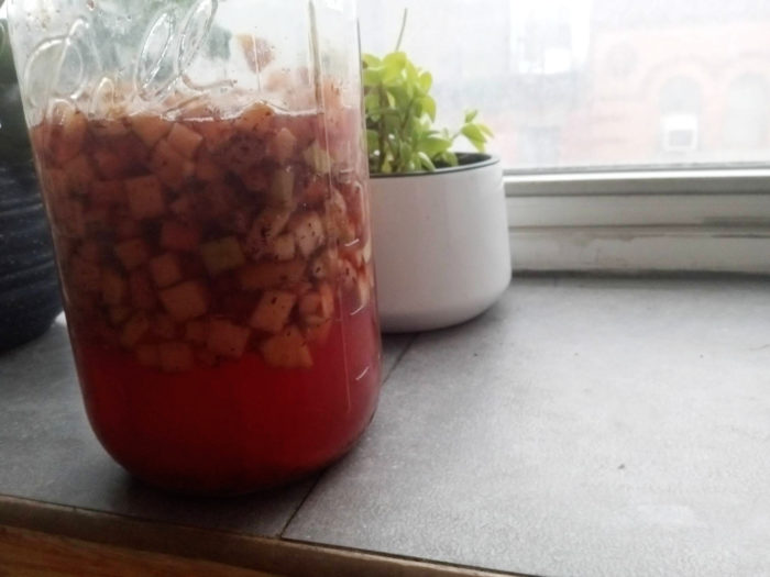 I didn’t even look up how to make it. I figure it’s tea, water, sugar, and a culture of yeast and bacteria. Instead of sugar, I used apples and a little maple syrup I had left over from my CSA years ago that isn’t sweet any more and I didn’t know what to do with. For all I know, I did it wrong and it could have tasted better.