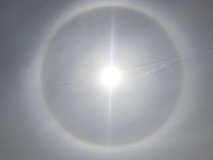 Update: Overcast skies led to a full rainbow almost directly overhead, a fun plus of experiencing nature’s beauty when I can. I don’t think I’ve ever seen this before. The photograph didn’t pick up the full color. I suspect the sun in the center of the frame makes messes up the exposure, though to my naked eye it wasn’t that colorful, just a bit more than in the picture.