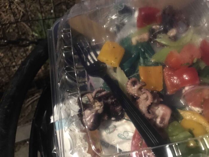 Getting closer, we can see amid the garbage and plastic, two octopuses bought and not eaten. The salad bar at the store is self-serve. They must have served themselves these once-intelligent now-dead creatures.