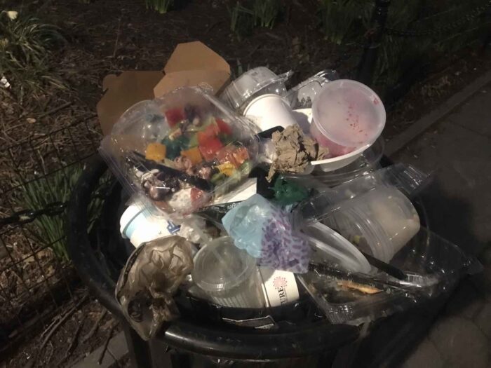 Why did I have to look up their intelligence? Because of how disgusted I felt, but didn’t feel I felt disgusted enough. Below are three increasingly horrifying pictures of a garbage can in the northwest corner of Washington Square Park. Here is the can, as usual, overflowing with garbage, nearly all single-use plastic.
