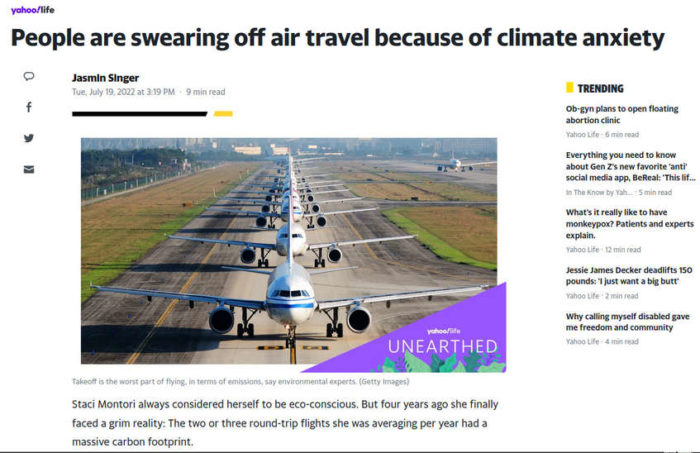 Yahoo! Life Unearthed quoted me in a story about people avoiding flying for climate reasons, People are swearing off air travel because of climate anxiety, by Jasmin Singer. I would add plenty more reasons to avoid flying beyond climate, including pollution, displacing people and wildlife from their land, and doing to nations what cars do to cities, but they focused on climate.