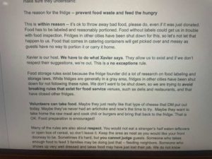 Some of the guests—that is, the people who take food from the fridge and cupboard—tell me that message is important since we produce so much waste. It’s not obvious that feeding someone today outweighs centuries of harming others. We may be net hurting people.