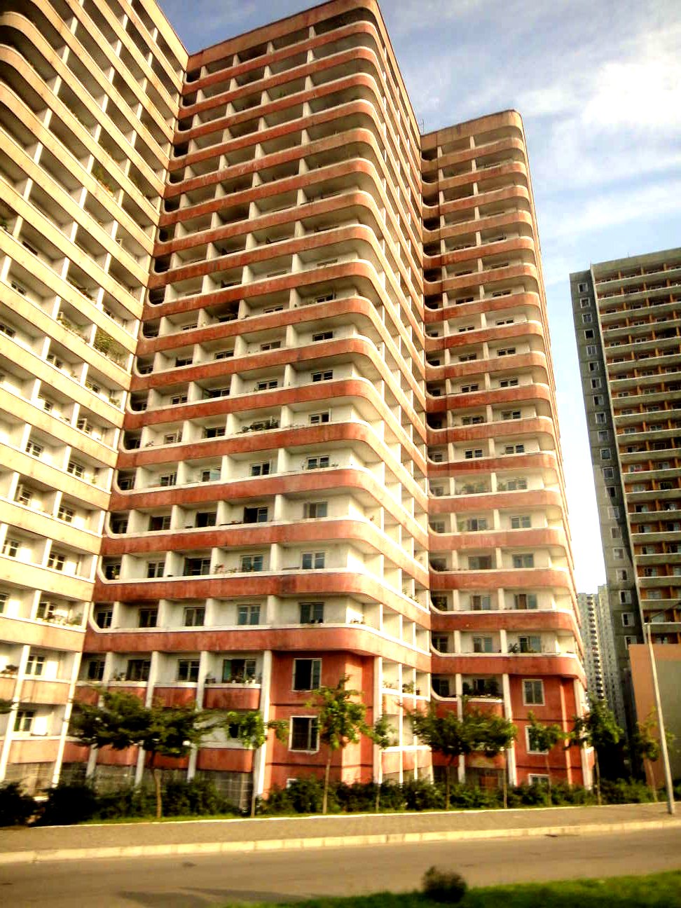 - One of the nicest buildings we saw. From this picture it could have been Miami Beach. On the first day I didn’t remark about the building, but now I’m surprised at the amount of unnecessary style in it. Most other buildings were purely functional, except government buildings. I wonder what led to the decision to make it round, give it decks, and stagger the decks spirally. Those design features must have cost money, but who has incentive to add them and who can pay for them? Do party leaders live there? (EDIT: see comment from a reader below, who found out about these buildings, including a video of them).