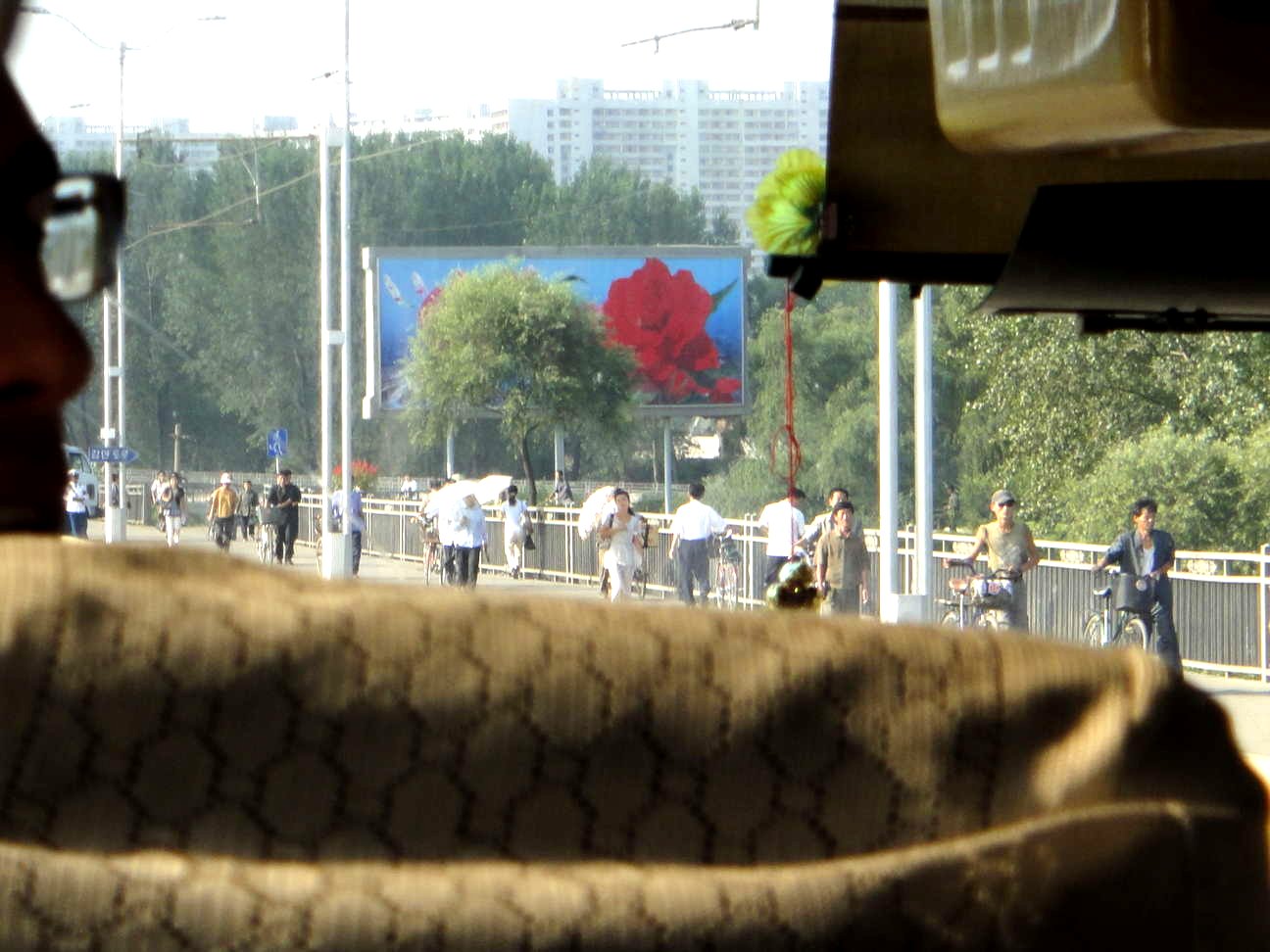 - People going about their business, with silhouettes from us in the bus in the foreground. One of my more common ways to describe visiting North Korea is that it is visiting Nineteen Eighty-four and Animal Farm. Even Airstrip One had color here and there. Pyongyang had a fair amount of green. I don’t know what this rose communicated. I photographed it to catch some propaganda but missed the shot again.