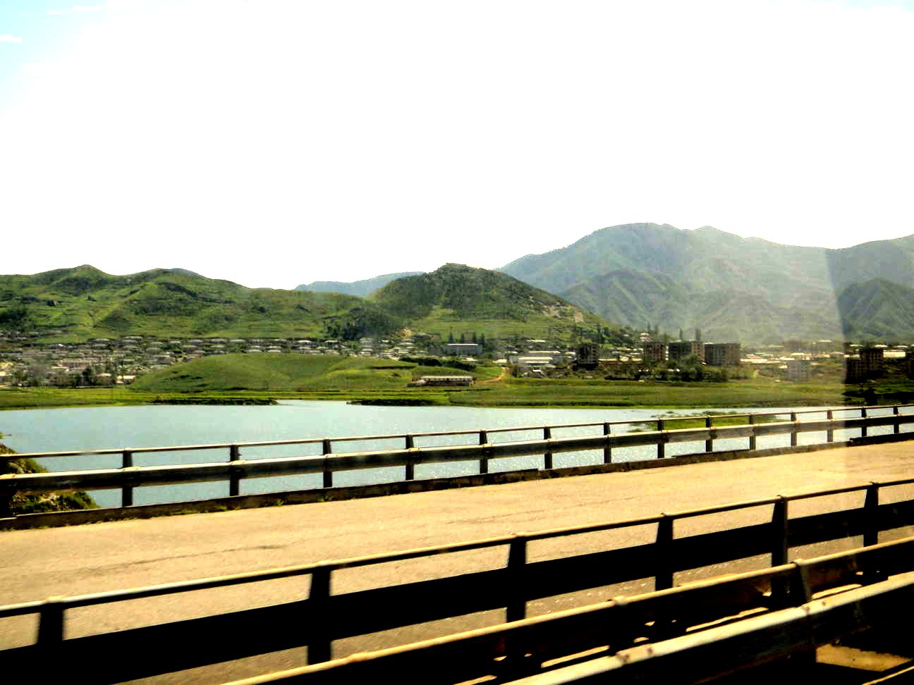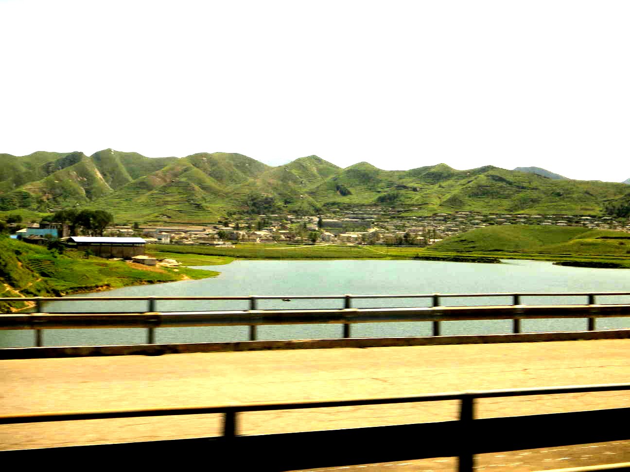 Many small towns dotted the countryside. Many of the homes were concrete slab-like buildings, many incomplete or poorly constructed. I saw no old buildings. I presume they were destroyed in the Korean War, though there may have been few after the Japanese occupation. Near one town we passed a couple bridges unfinished across the river to the side of the road like this one. They had the feel of ancient Roman ruins, but they were recent. I think one was for trains, the other for cars. But the buildings were incomplete and were falling into the river. I couldn't guess the age of the bridges. The road had almost no shoulder. Many people listlessly walked along the road or sat by the side. i don't remember ever seeing anyone in North Korea hurrying. Often we'd see kids just by the side of the road with no sign of parents.
