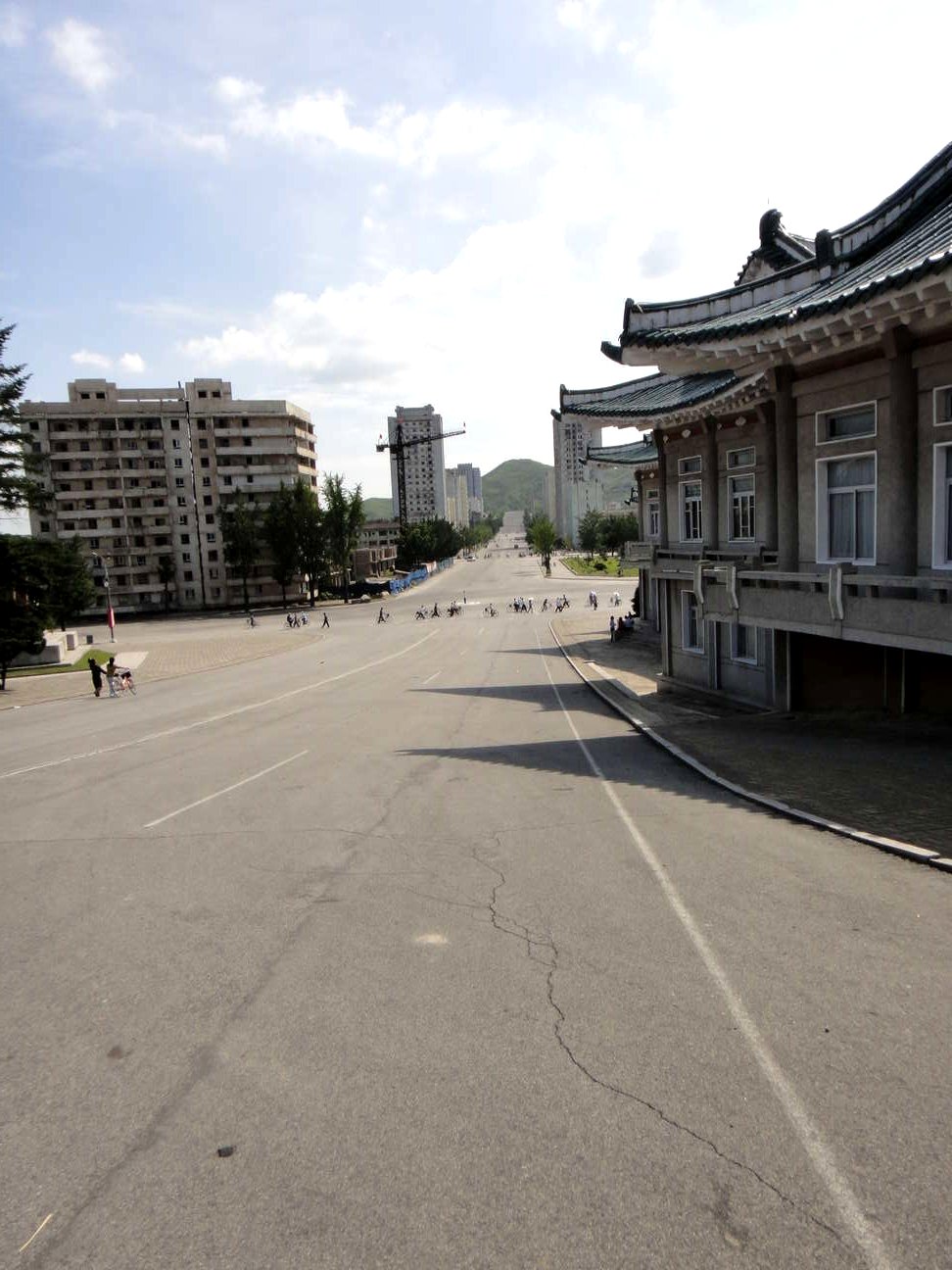 This shot of Kaesong illustrates the quintessential North Korea: huge wide streets with no cars in them, half-completed buildings, a bit of old-Korean style, a monolithic apartment building, a road going nowhere, no bright colors, and some people walking far distances.