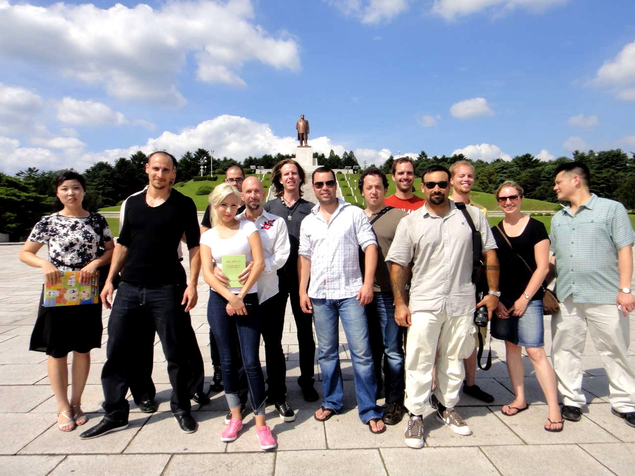 The group -- Ms. Yu (our North Korean guide), Alex, (I think Mr. Lee, another North Korean guide is behind Alex), Ingrid, Gabriel, Neil, Me, Jordan, Alex, James, Joseph, John, Hannah, and Dan. And, of course, Kim Il Sung benevolently standing behind us.