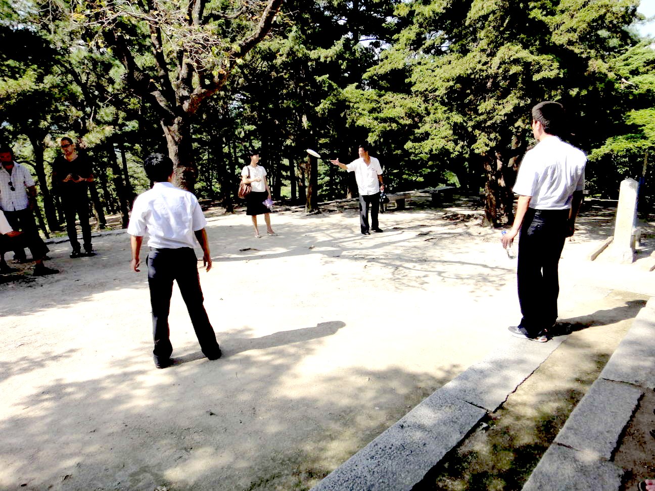 We'd already thrown discs around ourselves. Now the North Koreans began to toss the disc around. This park was between the view of the city and the statue of Kim Il Sung, so we were heading back to the bus, near where the girls with no parents around were playing jacks.