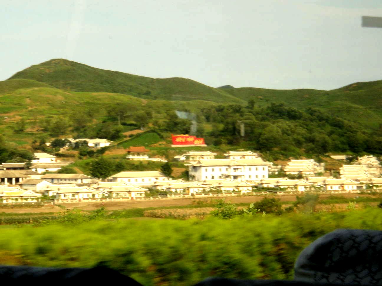 I kept trying to catch pictures of propaganda signs, but always got the camera out too late or the bus was going too fast. I'd sit there for tens of minutes with a camera ready, waiting for a sign. Then I'd put it away and we'd pass a giant sign. The red and yellow sign in the middle looks like it says something from the government, but you can't tell from the picture. On the other hand you get a nice picture of a North Korean town.