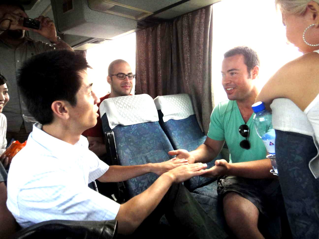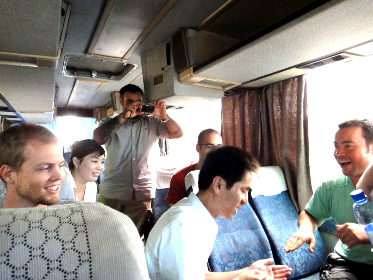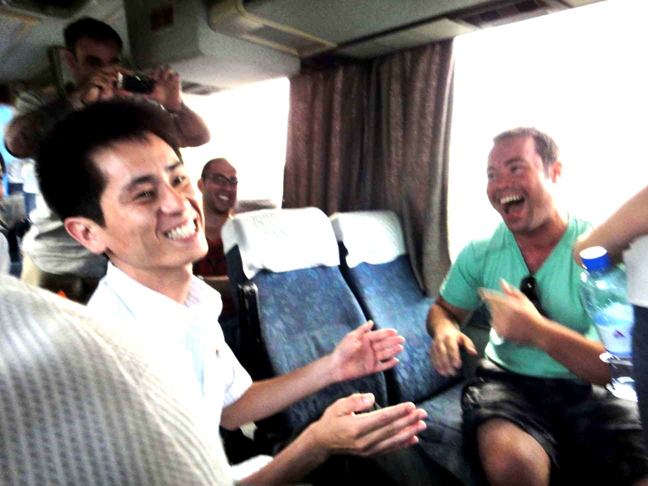 Mr. Kim and Jordan started playing children's games -- rock-paper-scissors type games. Here Mr. Kim was teaching Jordan a North Korean game where one player tries to guess which way the other will turn his head. If he guesses right he gets to hit him (lightly) on the forehead. Jordan realized he was getting hit in the head a lot and Mr. Kim wasn't. Everyone in the bus started watching these grown men acting like children.