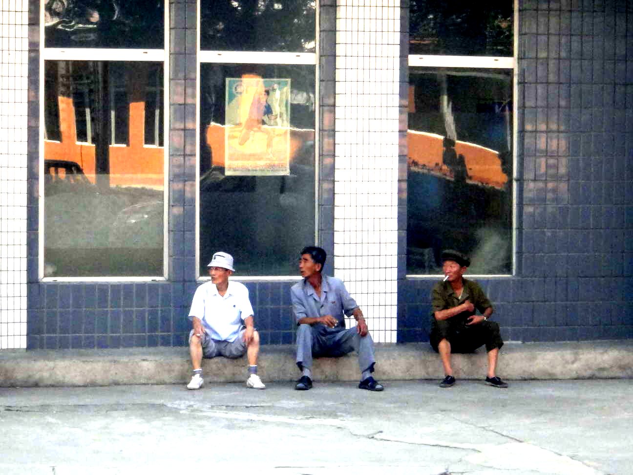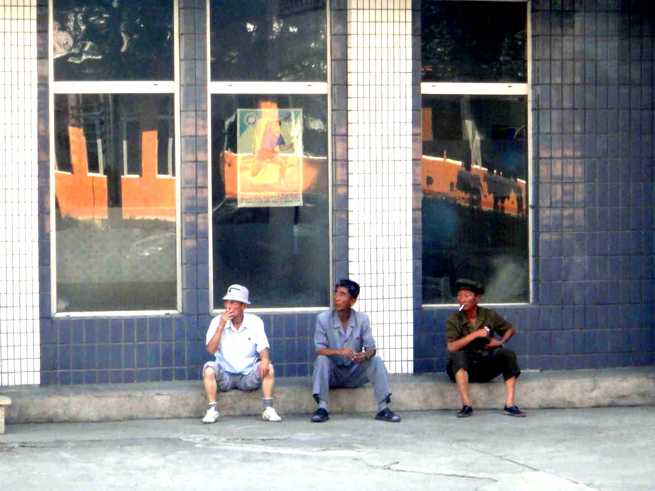 Another of my favorite shots — three men smoking, watching the world go by. The building doesn’t differentiate itself from others so there’s nothing special about the place. These guys are just watching Pyongyang happen, the one on the right dressed with North Korean style.