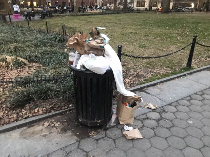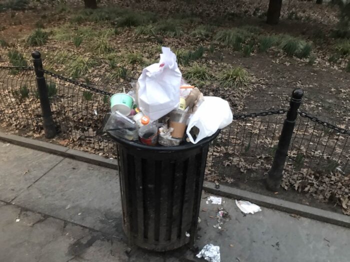 I only had the heart to take a few pictures and these cans were only partly overflowing. Others were surrounded by trash on the ground. As usual, effectively all the trash was doof and food packaging. Nearly nothing healthy, everything needless, wasteful expenses.