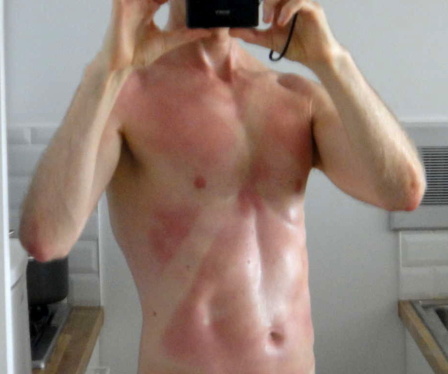 At the beach the weekend after Central Park I walked around without my shirt too, where it’s more normal. I put on sunscreen everywhere I normally get burned, which means what shows when I’m wearing a shirt, which means I didn’t put sunscreen on my front. I carried a bag over my shoulder and took the picture below not as an “after” picture from a body change but to document how silly I looked with the white non-sunburned strip from my bag strap.